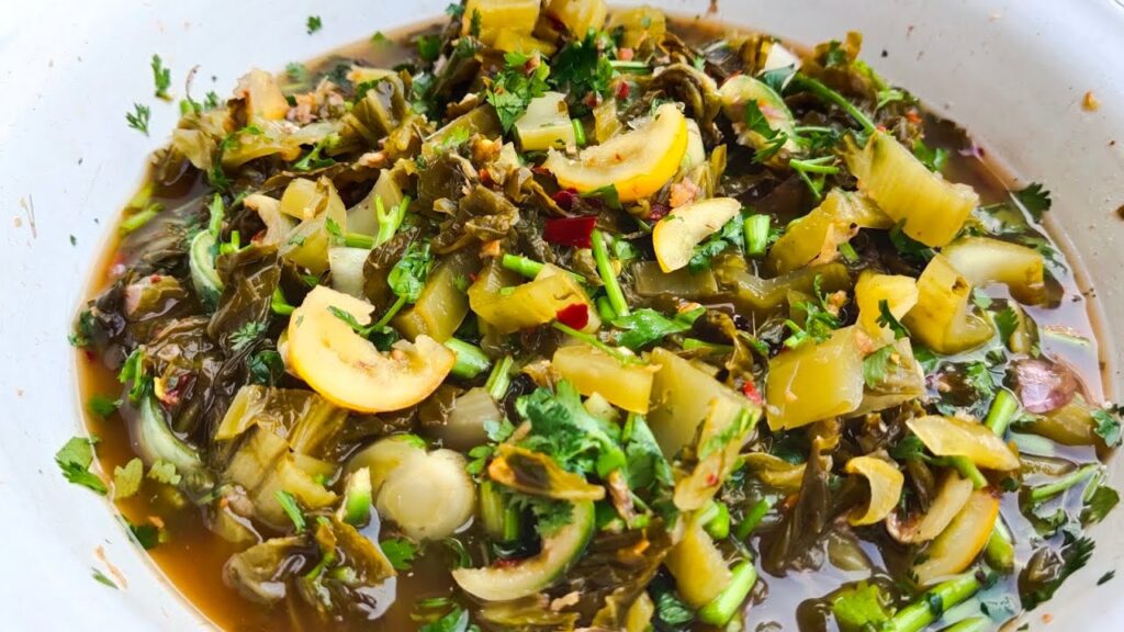 ยำผักกาดส้ม ก่อนที่จะนำผักกาดมาปรุง ต้องนำผักไปดองก่อน วิธีการดอง ใช้วิธีเดียวกับการดองผักกุ่ม แต่ใช้เวลาดองน้อยกว่า 2 วัน มีวิธีการปรุงเช่นเดียวกับยำผักกุ่มดอง ยำผักกาดดอง ต่างกันตรงที่จะใช้พริกแห้งย่างไฟ หรือพริกแต้แห้งย่างไฟ หรือคั่ว (เสาวภา ทาแก้ว, สัมภาษณ์, 2 กรกฎาคม 2550)